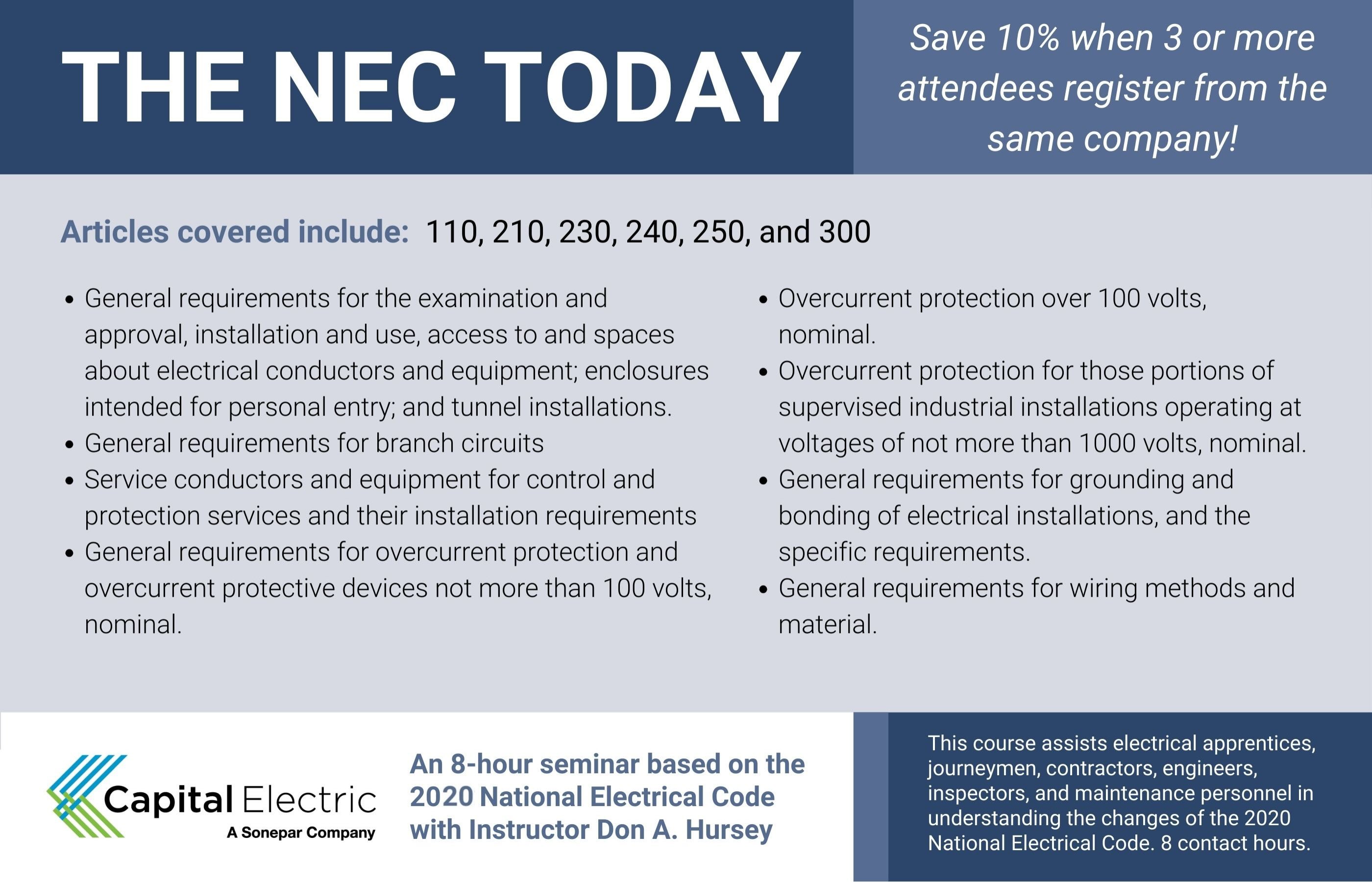 This course assists electrical apprentices, journeymen, contractors, engineers, inspectors, and maintenance personnel in understanding the changes of the 2020 National Electrical Code.
